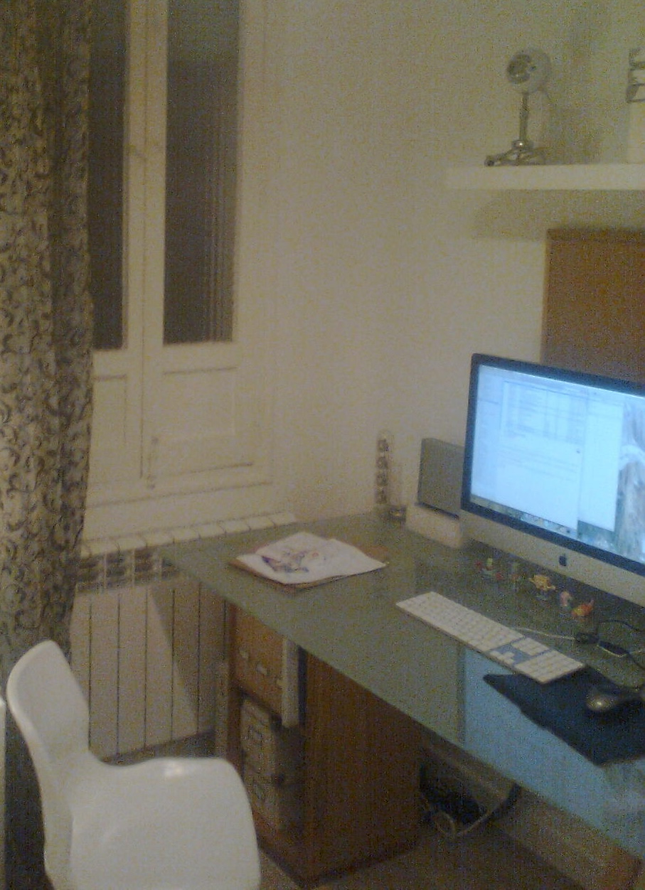 Start-up life, part 1. The Apple keyboard is now accompanied by a "Magic" Trackpad, and we see a MacBook Air next to a decidedly-not-4K Dell monitor (to which is taped a picture of a US keyboard layout because my brain was trying to recover after being rewired when using Spanish layout keyboards). In a minor concession to ergonomics, the monitor is raised close to a suitable height by sitting on a ream of paper, but it's not centered in front of the keyboard, something I'd never tolerate now.