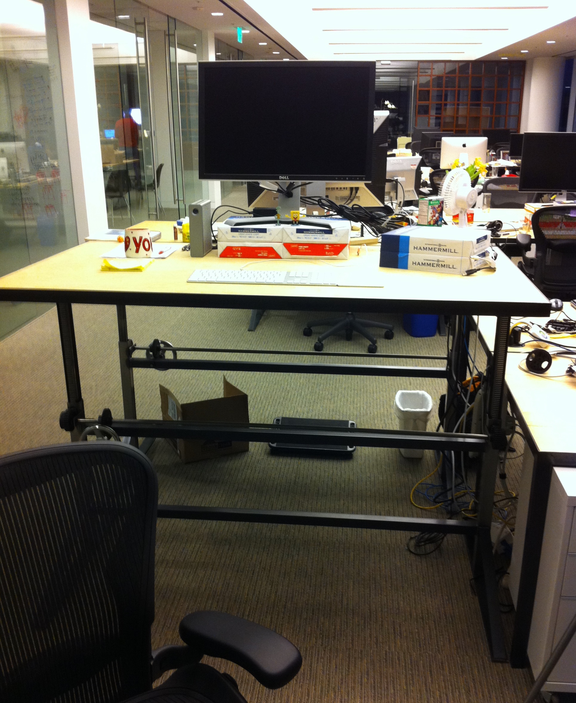 Part 2. The start-up life intensifies, with an Aeron chair and a crankable standing desk (horridly unsafe, BTW, with a bespoke mechanism). The LaCie has again joined me on the desk, but this time without the foam dampening block. In typical VC-funded bubble fashion, I've gone from a single ream of paper to six whole reams, significantly improving the ergonomics of the setup by center-aligning the monitor and elevating the laptop (that's what the two reams on the right are for).