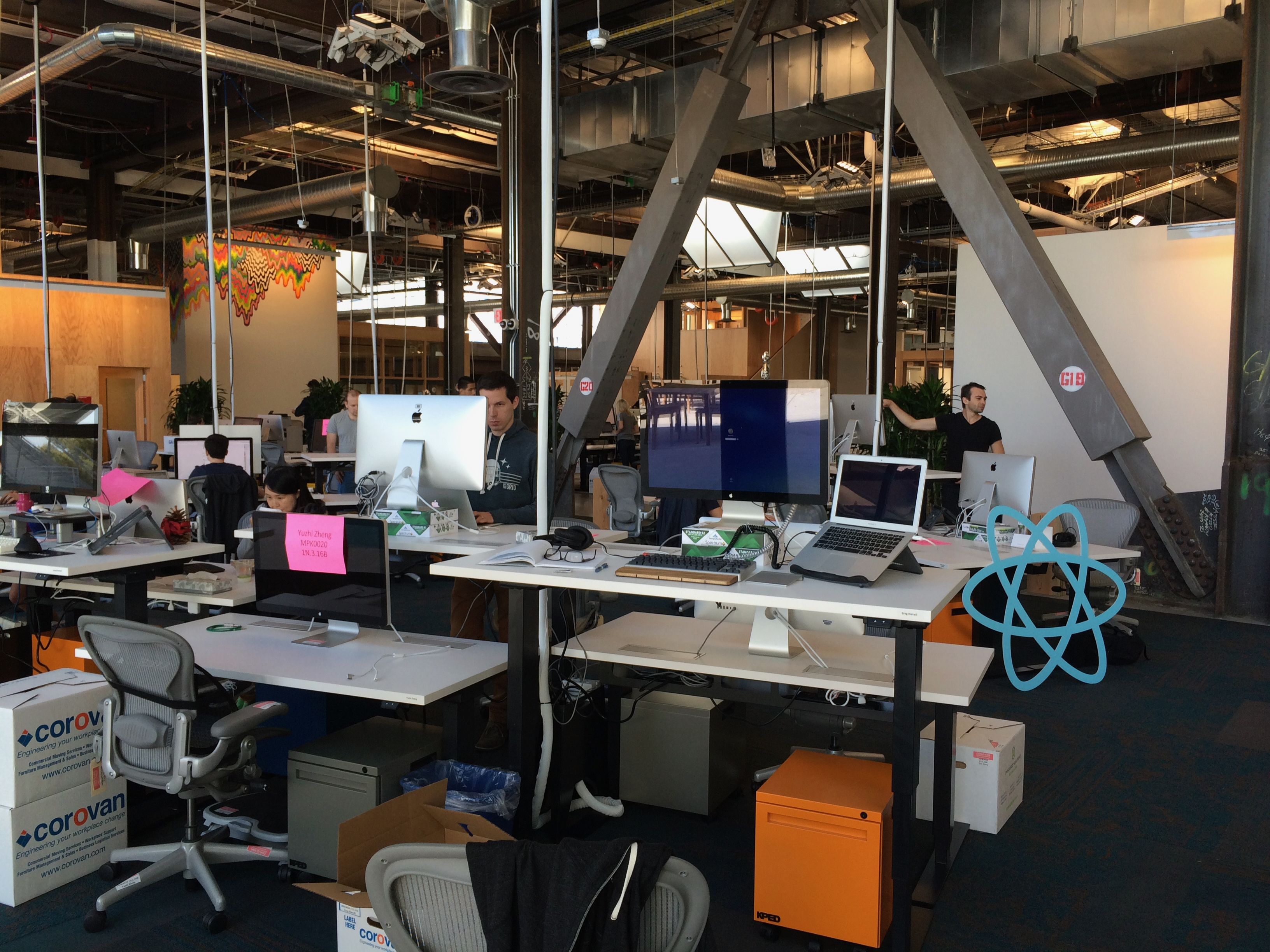 Fast-forward to 2015 and I just moved into this fancy building at FB along with the rest of Product Infrastructure. You get a standing desk! And you get a standing desk! You get a standing desk! Also, an "ergo consult" where they give you a real laptop stand and make sure your keyboard (now a Realforce) and display are at the right height. Some kind of Apple Monitor — I don't remember exactly which — but at that time it wasn't a 4K or Retina one. Some fun details in there, if you look closely, like a React logo leant casually against a desk, a glimpse of the corner of Zuck's "Acquarium" office in the background, and Joe Savona intently ripping through some some god-level-hard problem, as is his wont.