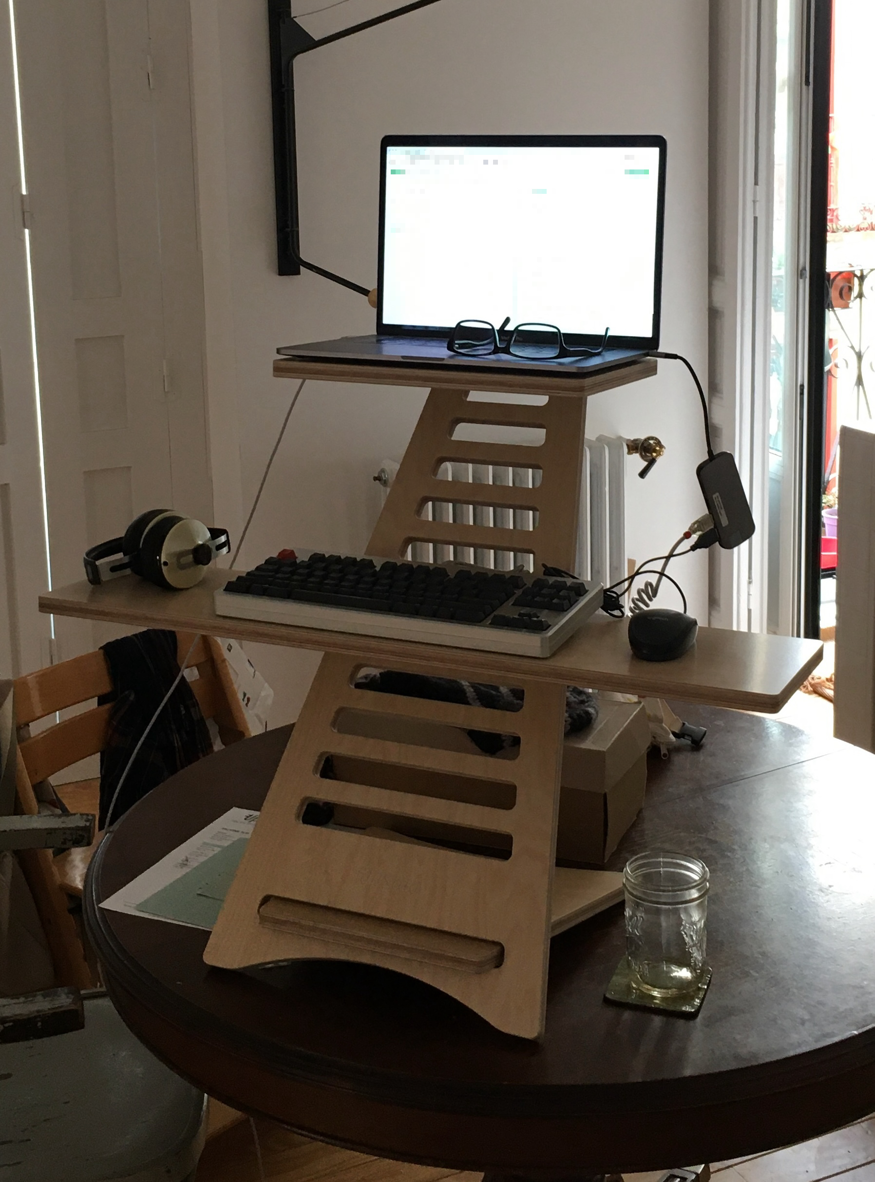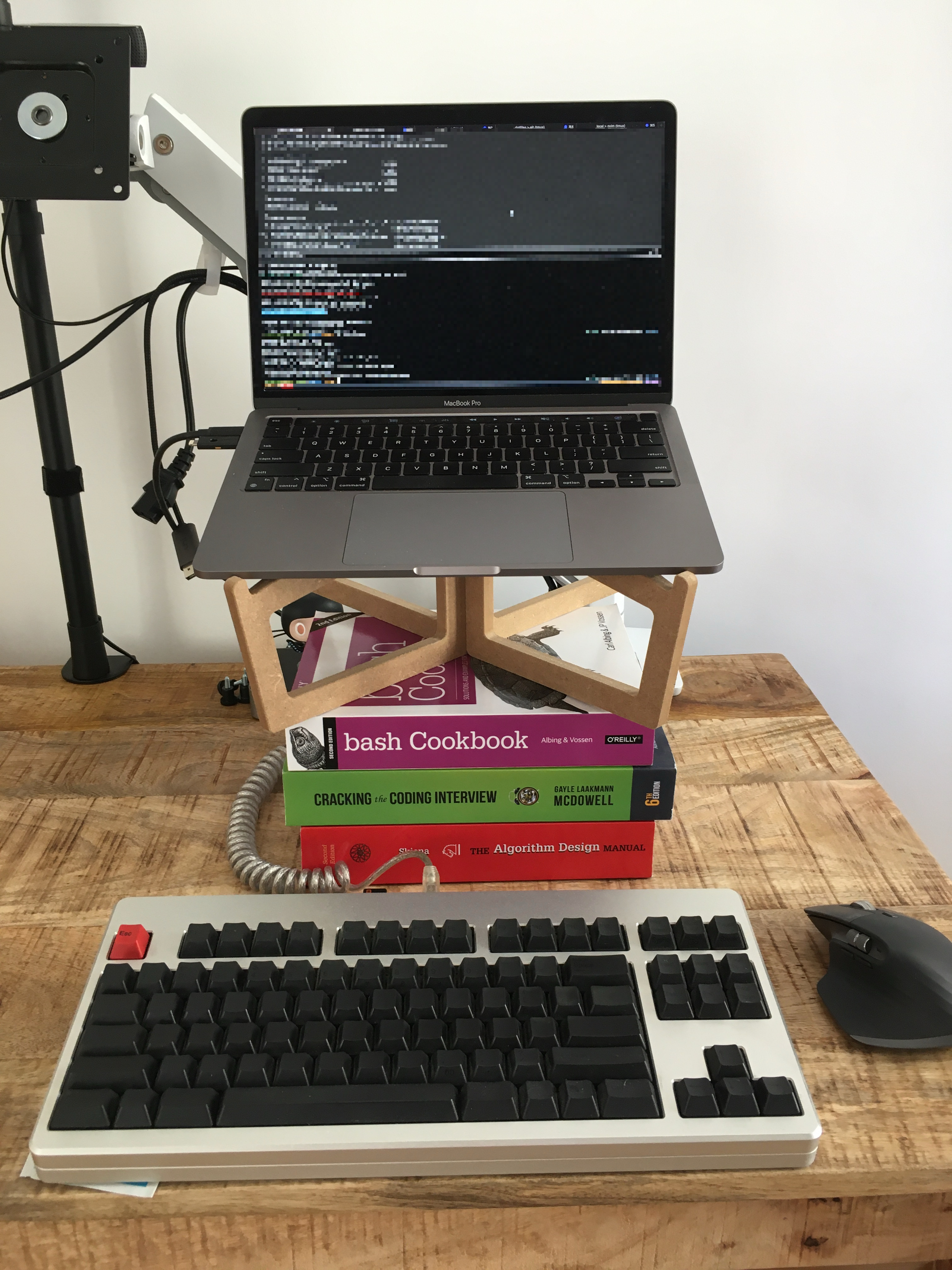 Still working from home, but now from the living room, and another employer. We're still afflicted with a cursed Touch Bar, but we have awesome Apple Silicon now. Note that the "upgrade"1 from the kitchen table to a dedicated but non-adjustable standing desk requires an ingenious new laptop stand2 while I send my intermittently faulty monitor away for warranty repair or replacement.