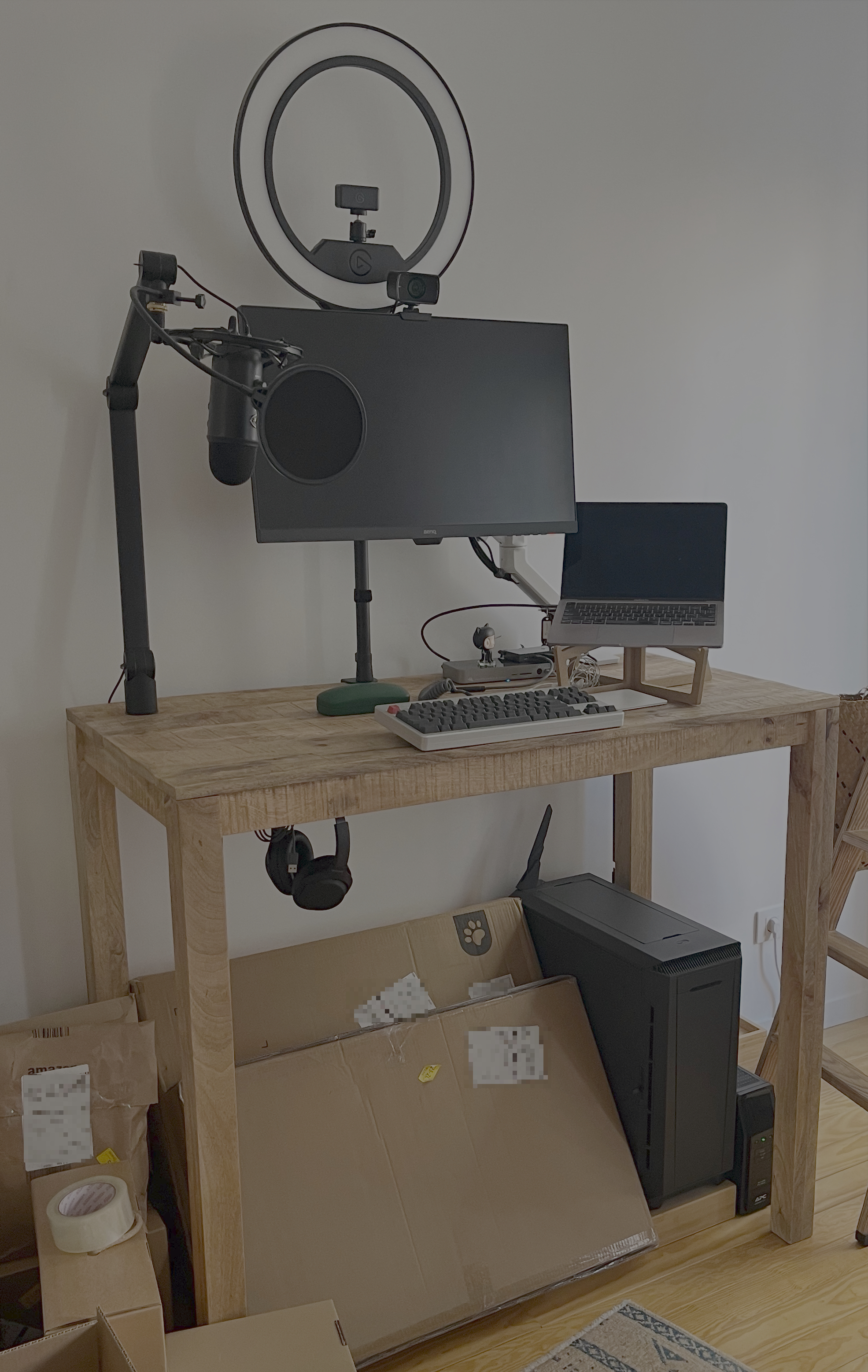 Better view of the same desk. Ignore the cardboard boxes (this was a moving day). Not too much has changed at this point, but I have acquired a few accessories, like a "Blue Yeti" mic and mount, and an Elgato ring light: both of those were principally chosen on the not-so-sound basis of being actually available (things got scarce in the pandemic), and I wanted to put my employer's "home office" budget to use. Also visible: new headphones, better in many ways, and my trusty Linux desktop.