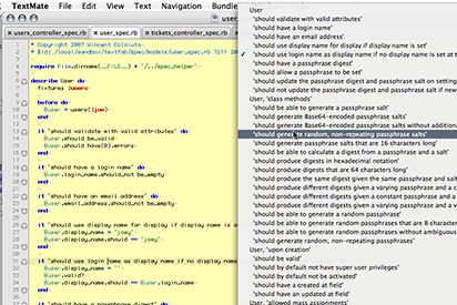 I've started off with some tweaks to RSpec's interaction with autotest, corrections to the shared behaviour functionality, and today I've made some basic extensions to the RSpec TextMate bundle: some additional syntax colouring and displaying behaviours and examples in the function pop-up as shown below:
