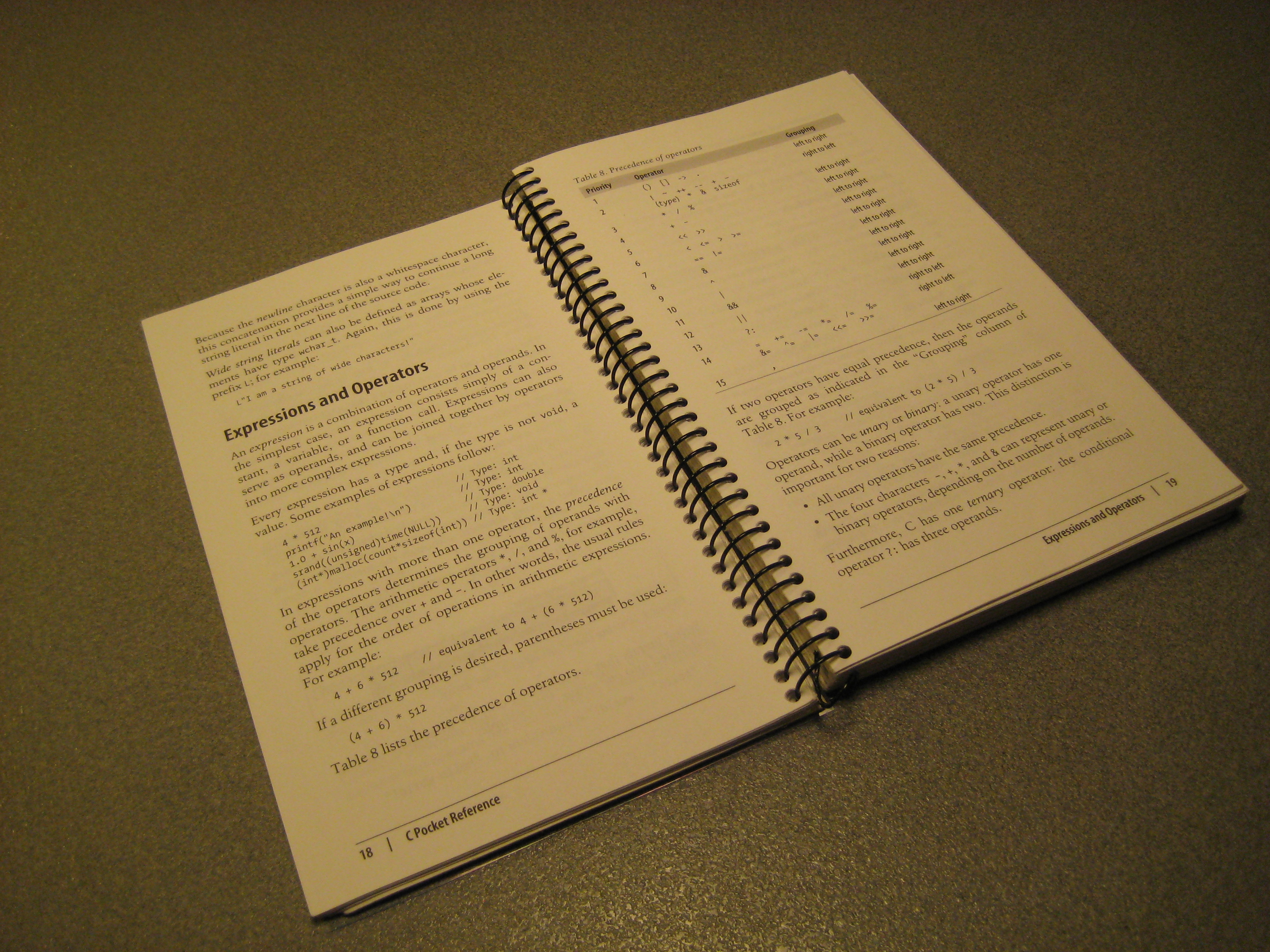 Way back in January 2006 I posted a photo of my favorite programming book. Yesterday this battered old manual was given a second life in the form of spiral binding. Now the pages are no longer in danger of falling out, and it can sit flat on the desktop (3072x2304 JPEG, 3.5MB).